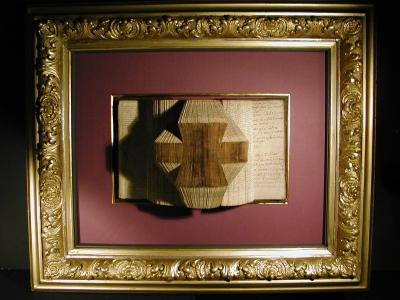 Book folded; the old cover of the book can be seen on the reverse side of the object; 120 years old frame with golden cover and a wine-red passe-partout with an inner frame in genuine gold gilding. |