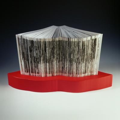 Book folded, countersunk in a red lacquered base shaped as a lip. |