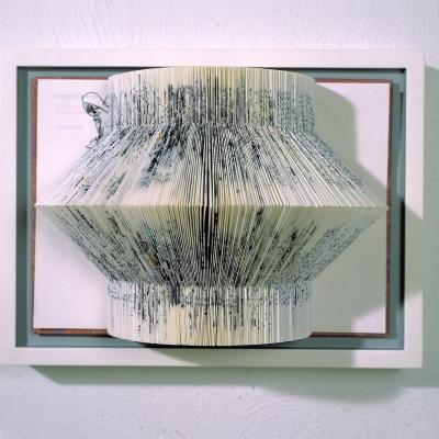 Folded book; white lacquered wooden frame with grey painted groove |