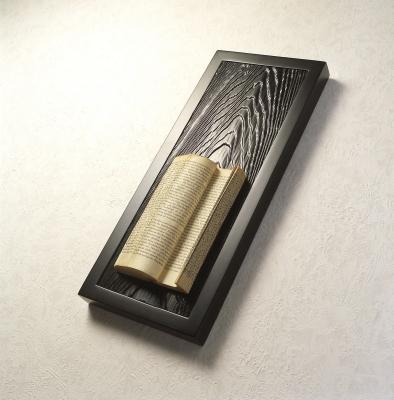 Beschreibung: In diesem kleinen Kunstwerk korrespondieren das gefaltete Buch und die lebhaft gemaserte Holzplatte, auf die das Buch montiert wurde. Das Buch erweckt den Eindruck, als ob der Leser gerade seine Lektüre fallen gelassen habe; die gefalteten Seiten sind noch aufgeschlagen, sodass sie die Wellenbewegung des schwarz lackierten Holzes aufnehmen.
