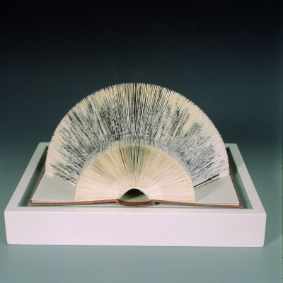 Jedes Buch des zweibändigen Werkes wurde von Claudia Steiger auf eine andere Art gefaltet und in einen weißen Rahmen montiert. Ihr ging es bei der Gestaltung darum, sowohl das Runde und Geläufige in der Sprache von Wilhelm Busch, aber auch seine Spitzfindigkeit zum Ausdruck zu bringen. Schalkhaft wie in seinen Geschichten lukt der wohlbekannte, geschwungene Hut des Dichters hinter den gefalteten Buchseiten hervor. |